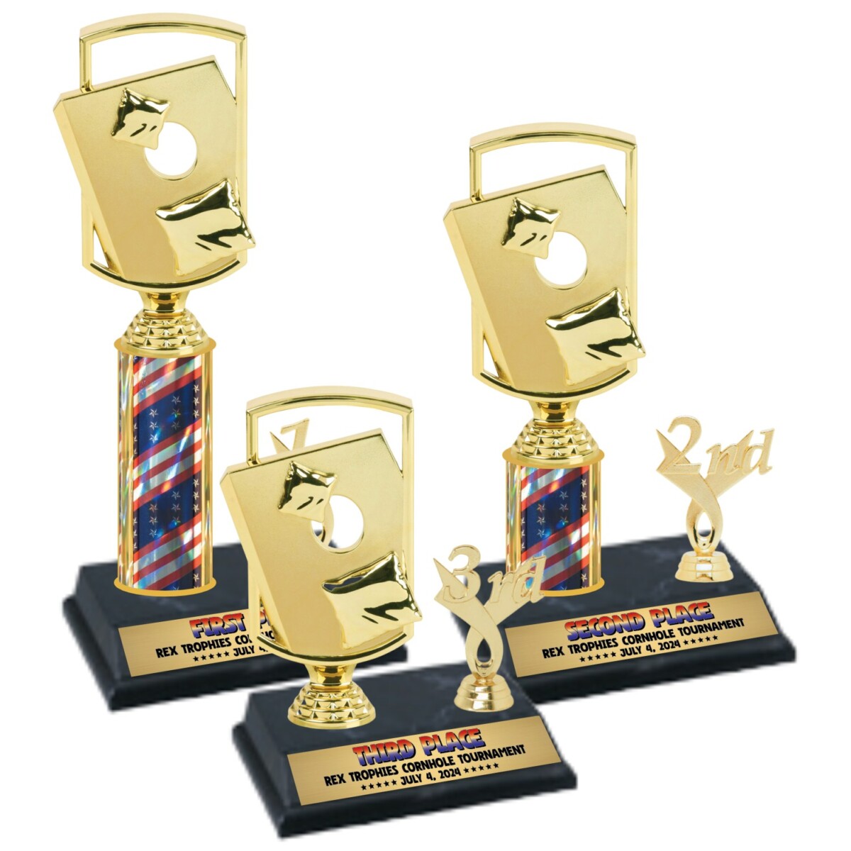 Nothing beats a traditional trophy like our Cornhole Trophy! The Cornhole Trophy is great for everything from friendly family competitions to large corporate cornhole events. Just choose from a handful of placement titles, enter your competition name and a date, and our Trophy Artists will handle the rest. Ordering a silly little trophy has never been easier!